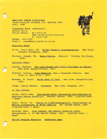Typescript syllabus for course American Indian Literature, by Stephanie Mood, instructor at Grossmont College. Syllabus includes logistical course information but also information about Native American tribes located within San Diego County, including demographic information and information regarding reservations, as well as a map of linguistic groups and families of California Indians, a map reproduction of the Prinicipal Indian Tribes of North America, a list of state names taken from American Indian words, a map titled "Indian Tribes of America," a list of tribes by culture area and language family, and a document titled "Gifting the White Man... Despite the Betrayals" covering Native American contributions to food, medicine, government, wealth, and wisdom, and outlining various negative impacts and betrayals wrought by settler colonialism. Contextual material was created by the San Diego American Indian Health Center. Process of OCR created a skewed image on page 7 of digital surrogate.