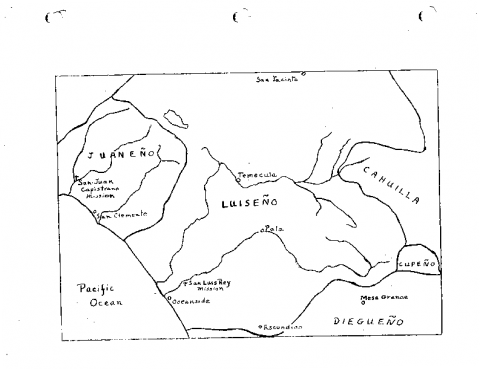 File contains multiple documents as follows: 1) Map of Southern California Indian tribes with locations of missions and cities; 2) Map of Southern California Indian tribes with locations of missions, cities, and geographical features; 3) Henry Rodriguez's story notes and vocabulary; 4) Map of major American Indian tribes of the Southwest; 5) Two maps of linguistic groups and famlies for California Indians; 6) Letter from Henry Rodriguez to Louise Robbin in support of a "Mission Period" television documentary; and 7) a document by Henry Rodriguez as told to Robins Commans regarding Rodriguez's thoughts on the Mission Period.