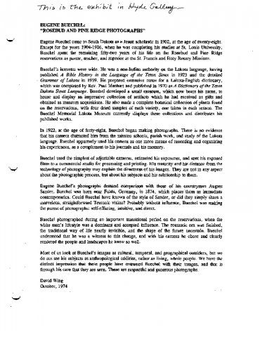 Typescript biography of Eugene Buechel, a "non-Indian authority on the Lakota language," pastor, and photographer at the St. Francis and Holy Rosary Missions, Rosebud and Pine Ridge reservations. Handwritten inscription at top of manuscript reads, "This is the exhibit in Hyde Gallery--"