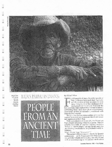 File consists of articles related to Paipai and Kumeyaay Indians of Baja California, as follows: 1) "Baja's Paipai Indians: People From An Ancient Time," by Michael Wilken, Baja Explorer, November/December 1992; 2) "Paipai Pottery" by Michael Wilken, Baja Explorer, November/December 1992; 3) "Early Arrivals" by Michael Wilken, Baja Explorer, November/December 1992; 4) "Rare Visit By Baja California Indians," "Crafts Corner," and "Indian Fair Foods," published in Discovery: A Monthly Publication of the San Diego Museum of Man, June 1993; 5) "Baja Indians are visiting Sijuans" by Chet Barfield, San Diego Union-Tribune, June 11, 1993; 6) "Long-Lost Brothers, Long-Lost Sisters: Indian Fair Hosts Bi-National Reunion," and 7) "Traditional Way" by Nelvin Cepeda, San Diego Union-Tribune, July 30, 1994.
