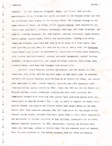 Typescript history of the Kumeyaay people. Contains a further reading list and a list of Kumeyaay reservations.
