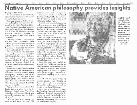 Scans of three clipped newspaper articles featuring Celia Silva, Paipai American Indian from Baja, Mexico. 1) "Native American philosophy provides insights" by Judy Winter Meier, published in the Borrego Sun, regarding the Native American Educational Resources Symposium at Anza Borrego Desert State Park, February 7, 1997. 2) "Native American Days" February 8-9, 1997 at Anza Borrego Desert State Park, published in the Borrego Sun, photographs by Brenda Colby. 3) "Kumeyaay Culture," published November 17, 1994 in The Beacon by Paul Hansen, with image of Celia Silva using junkas grass to demonstrate basket-making.