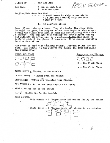 Typescript document and handwritten notes describing the setup and rules for the Peon Game, played by eight men and boys with bones and counting sticks.