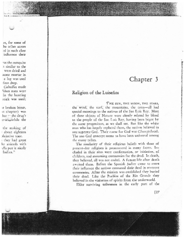 Photocopy of book chapter, "Religion of the Luiseños [in Southern California]" regarding religious beliefs and ceremonies of the Luiseño American Indians.