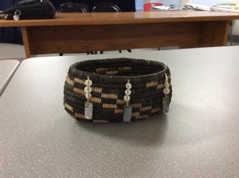 A small Pomo coil basket, likely made out of deer grass with the sewing strand either made out of sedge, or white root.